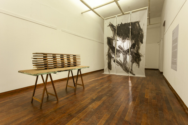 Una reseña sobre la instalación de Bruno Juliano y Rodro Cañás Por Maximiliano Castro | Entré sin mapa, no por decisión propia, sino arrastrado por el anhelo de ver aquello que no se puede decir. Ya en la antesala, el vidrio de la puerta ofrecía un reflejo inusual. El aire parecía enrarecido por una sombra. A un lado, colgaban tres velos de papel translúcido: manchas negras y trazos enérgicos suspendidos