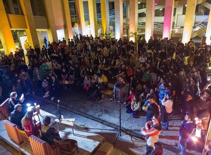 La tarde se va apagando y de a poco nos desplazamos hacia la Facultad de Derecho. Allí, un patio repleto nos recibe entre cervezas y puestos humeantes de comidas.