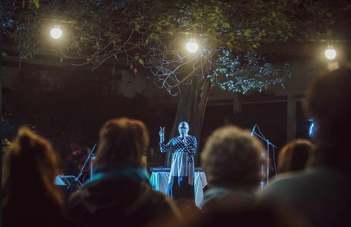 El escenario montado sobre el patio central se llena de luces, instrumentos y artistas enmarañados entre los cables. La gente se acomoda alrededor.