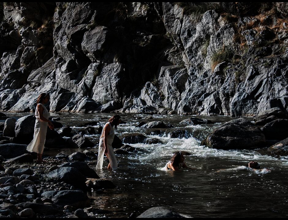 Unos meses más tarde, María José participó de la residencia de arte contemporáneo Raíces[ii] que tiene lugar en Aconquija, Catamarca. En esta residencia realiza otra performance. Aquí las flores desaparecen y el agua pasa a ser el soporte de la obra: usando el mismo vestido de lienzo que usó en el museo, se sumerge en el río Potrero de Catamarca (río que lleva aguas de deshielo provenientes de los nevados del Aconquija) y flota en un gesto de fusión con la naturaleza, sin intentar dejar ninguna huella más que en su memoria.